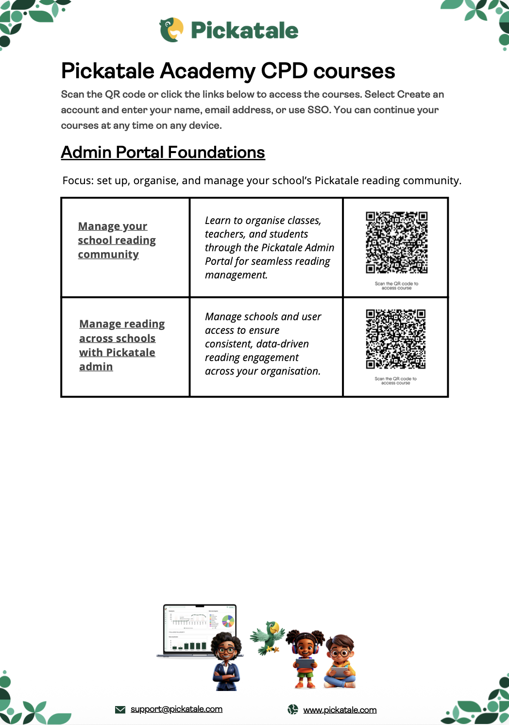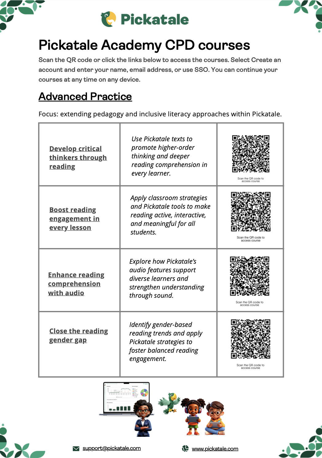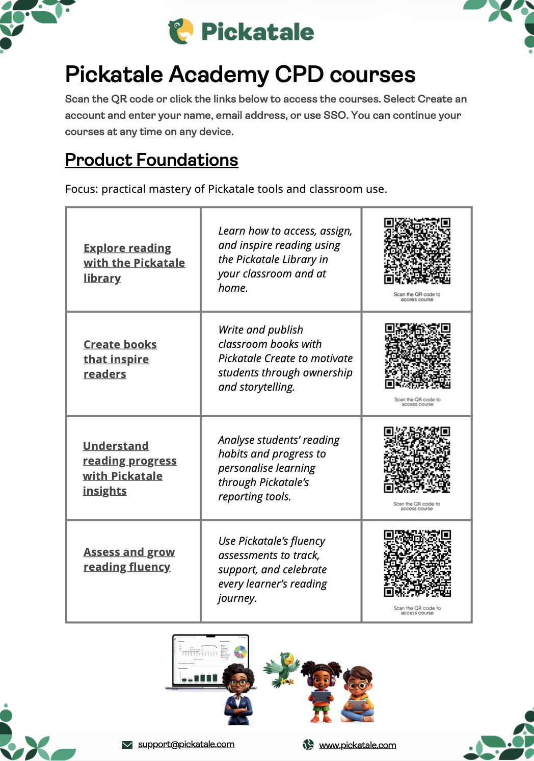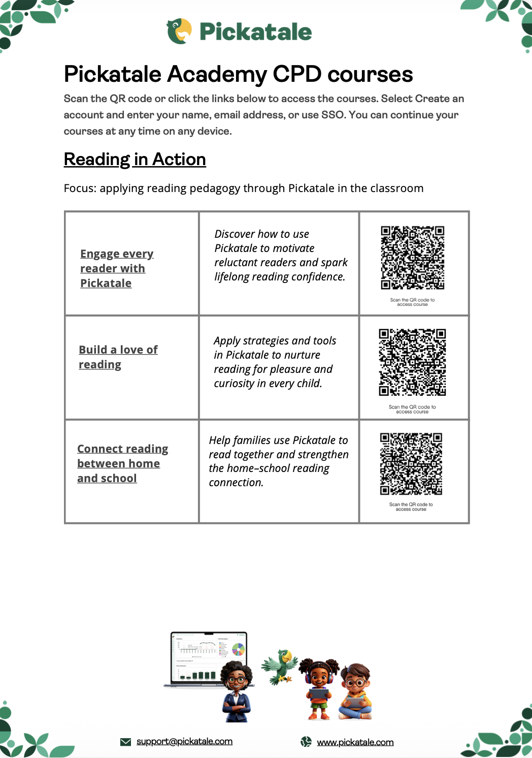 Scan the QR codes to access the free Pickatale Academy CPD courses or download the PDF and click on the hyperlinks.